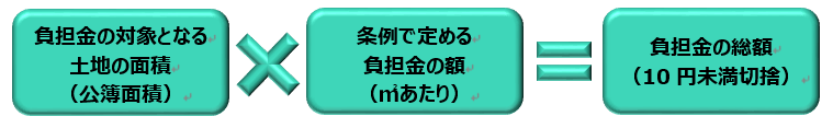 「負担金の対象となる土地の面積」に「条例で定める負担金の額」を乗じて得た額を納入していただきます。なお、算定式及び「条例で定める負担金の額」は下記のとおりとなります。