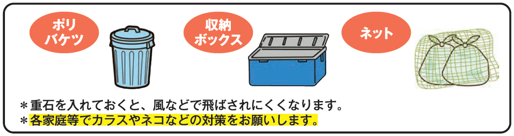 収集日の朝8時30分までに、透明か半透明の袋に入れて出してください。