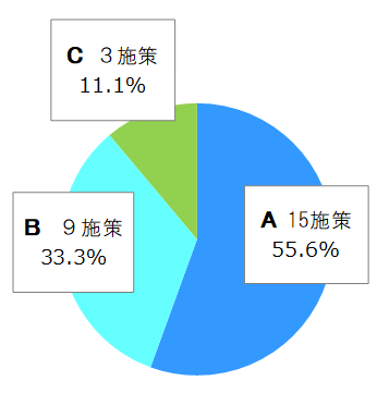 第10次厚木市総合計画第1期基本計画(計画期間:令和3年度~令和8年度)の3年目となる令和5年度事業を対象とした令和6年度施策評価では、27の基本施策全体について、15施策がA評価(順調)、9施策がB評価(おおむね順調)、3施策がC評価(やや遅れ)という結果となりました。