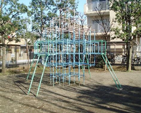 団地の裏手にある、周囲に木々が植えられていてジャングルジムが設置されている、なかがわらけやき公園の写真 拡大画像 (JPEG: 62.4KB)