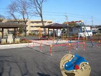敷地の中央に2つの東屋があり、手前にはブランコやラッコの絵が描かれた遊具が設置されている公園の写真 拡大画像 (JPEG: 55.0KB)