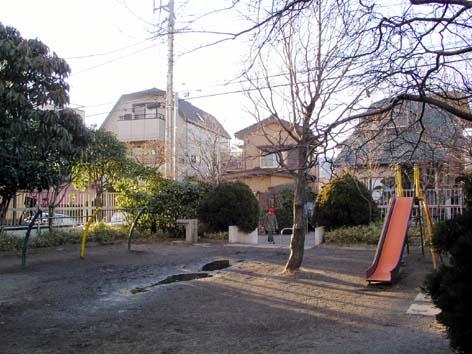 住宅街の一角にあり周囲を樹木が点在し、すべり台などの遊具が設置されている中原公園の写真 拡大画像 (JPEG: 40.3KB)