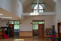 広々とした遊戯室の壁際に卓球台や滑り台などの遊具が置いてあり、右側は吹き抜けになって開放感のある造りの七沢児童館の遊戯室の写真 拡大画像 (JPEG: 66.5KB)