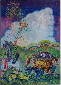 夜空に打ちあがる花火と、跳ねている魚が描かれている絵 拡大画像 (JPEG: 400.3KB)