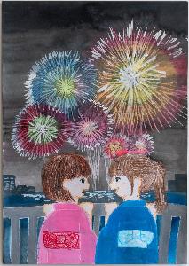 空に打ち上げられている花火と家族や魚が描かれている絵 拡大画像 (JPEG: 402.9KB)